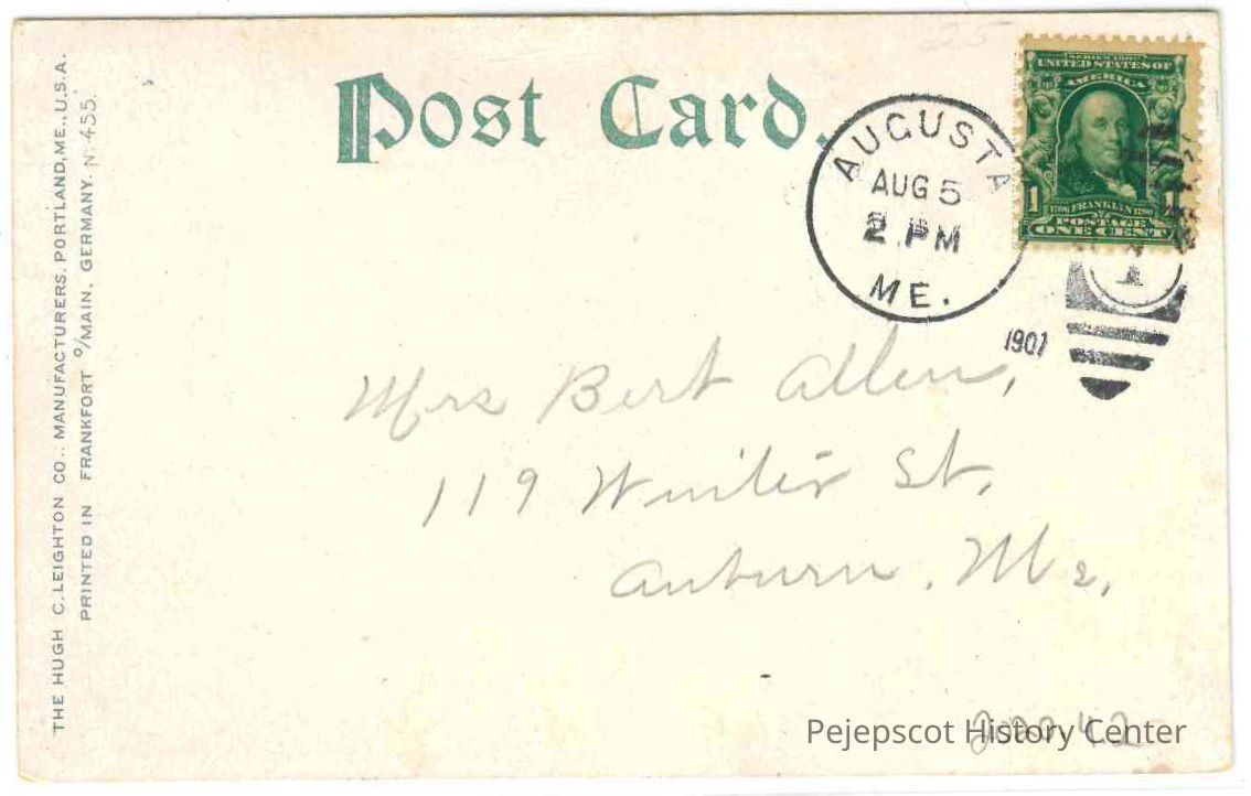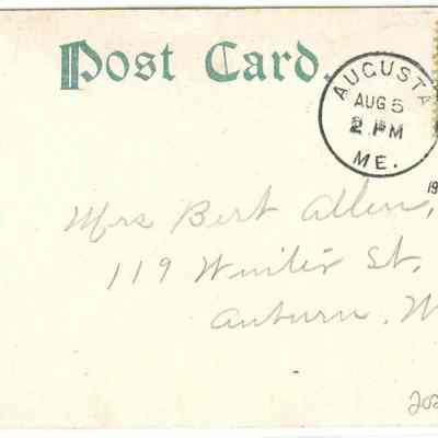 The postcard was sent to Mrs. Bert Allen at 119 Winter Street, Auburn, Maine. It is postmarked dated 08/05/1907 at 2pm.Lexicon