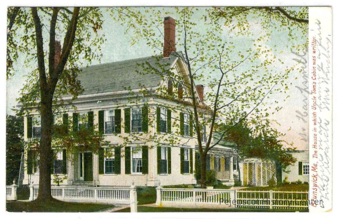 A color postcard titled, "The House in which Uncle Tom's Cabin was written." It depicts the Harriet Beecher Stowe House on Federal Street in Brunswick, Maine. The postcard was published by the Hugh C. Leighton Co. Manufacturers, Portland, Maine. It was printed in Frankfort, Germany.