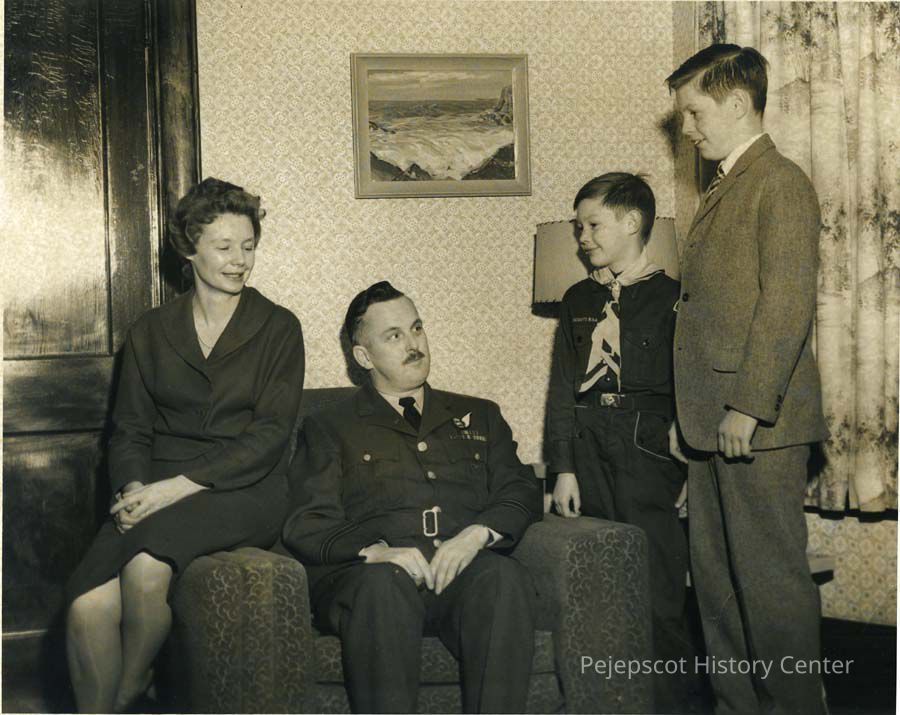A B/W photograph of the John family. Flight Lt. John A. John, his wife Elizabeth and sons Stephen (9) and John (13). Undated