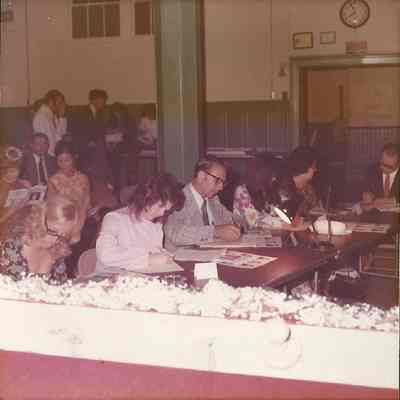 The judges L. to R. are Sheila Cooper, Barbara Hinckley, Aime Norman, Nina Schlikin, Ellen Cooper and Dick Tomko tabulator.Collection