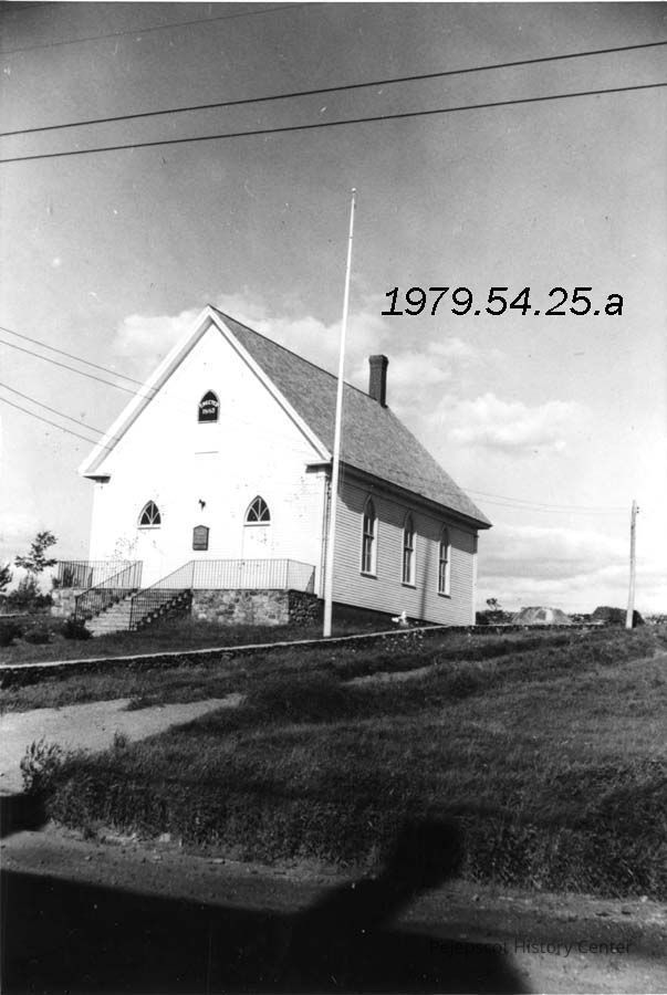 A black and white photograph of The Little White Church on Bailey Island, ME. Dated August 25, 1938.