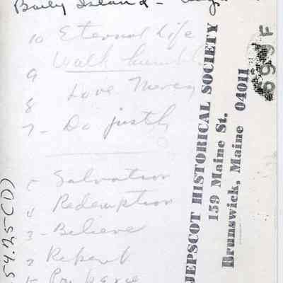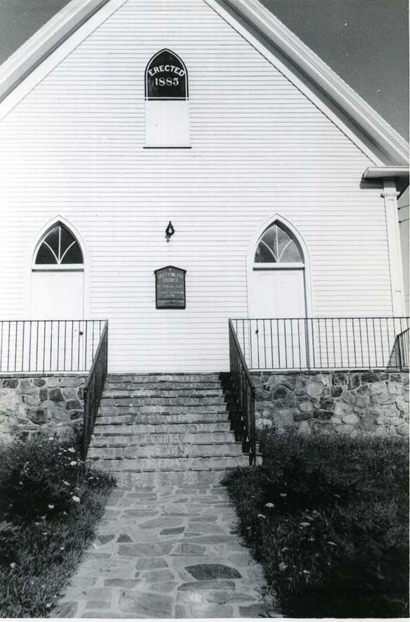 A black and white photo of the steps of the Little White Church on Bailey Island, ME. The steps are labeled in descending order: