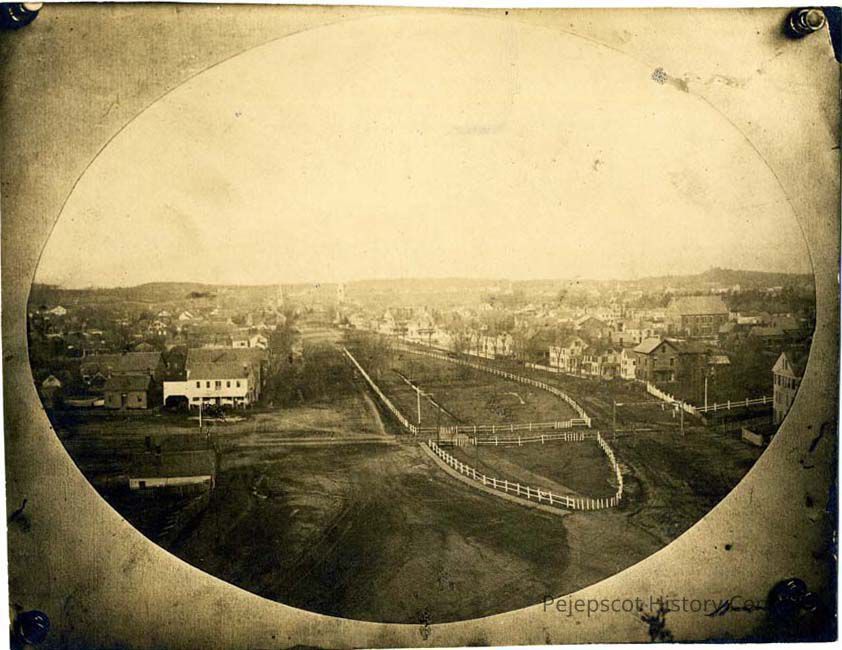 An oval B/W birds eye view of the Mall, Maine Street and Park Row. Accession paperwork dates this to 1850.