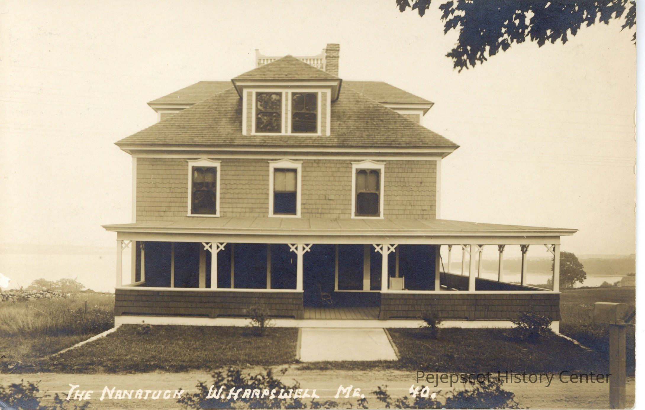 Black and white photo postcard of two story house, with a wrap around porch, overlooking the water In West Harpswell, Me.Collection
