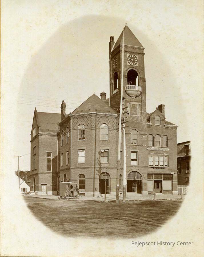 A B/W photograph of the old Brunswick Town Hall, Brunswick, ME. In front of the Town Hall, a small fruit cart is visible. Dated 1890.