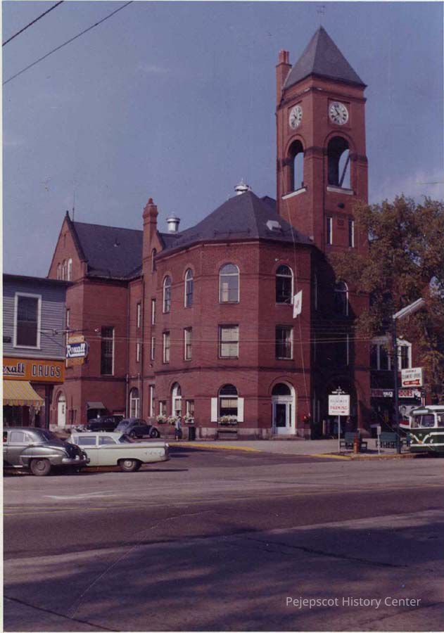 A color photograph of the Old Brunswick Town Hall, Brunswick, ME. There is a drug store shown toward the left and cars parked in front of the building. Dated 07/1961.