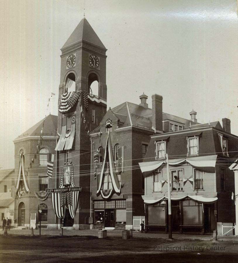 A B/W photograph of the old Town Hall located on Maine Street, Brunswick, ME. The building is decorated with patriotic bunting for Brunswick's 150th anniversary. Dated 1889.