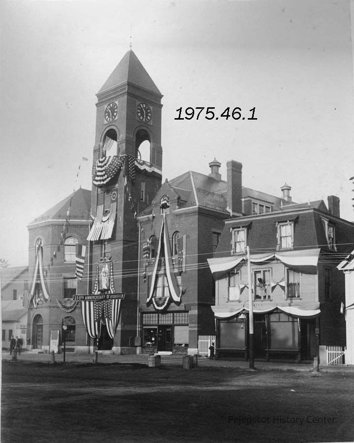 A B/W photograph of the old Town Hall located on Maine Street, Brunswick, ME. The building is decorated with patriotic bunting for Brunswick's 150th anniversary. Dated 1889.