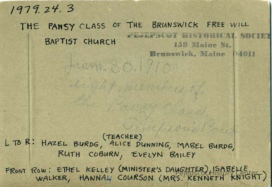 A sepia-toned photograph of the Pansy Class of the Brunswick Free will Baptist Church. The photo may have been taken on Simpson's Point (see pencil markings on back, photo #2). The people in the photo are identified as:
