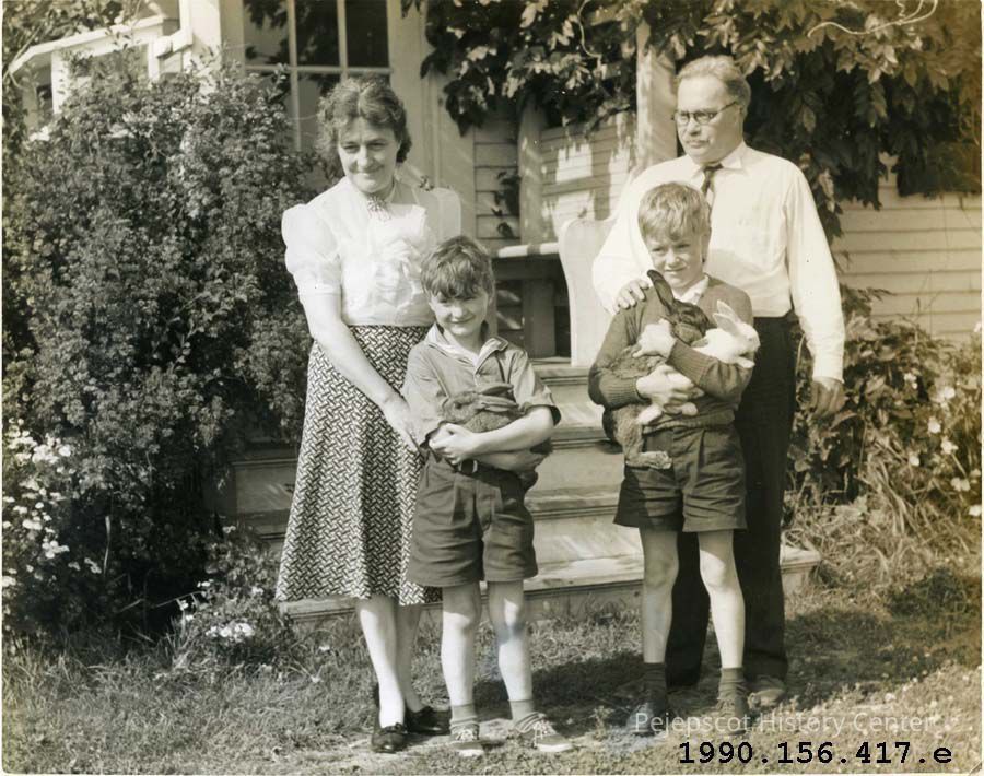 A B/W photograph of Mr. & Mrs. Gerald Trowbridge Pulsifer and adopted boys David (age 6) and Jonathan (age 8). Both boys are holding rabbits. Undated