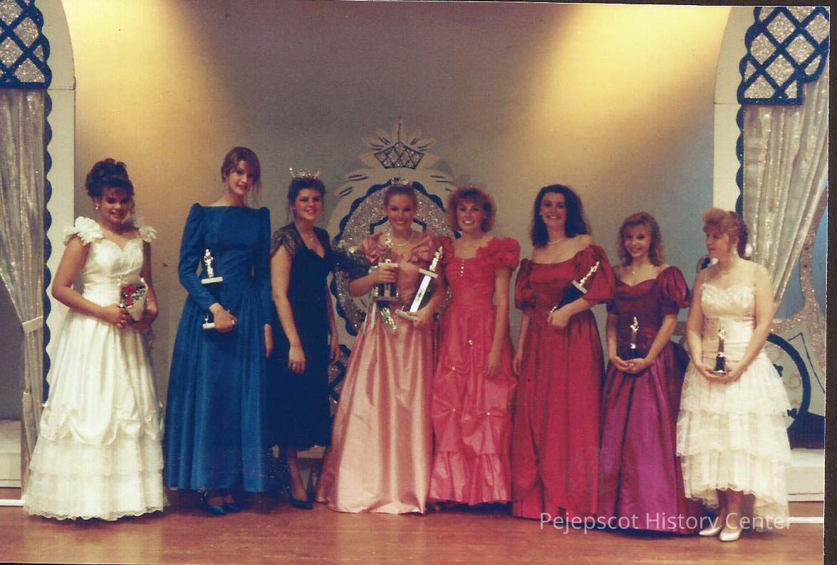 A color photograph of the queen and her court; Courtney Garrison, Kristen Stevens, Stacy Bean, Queen Darby Labbe, Robin Moody, Cara Martin, Corrie Pottle and Denise Matheson.