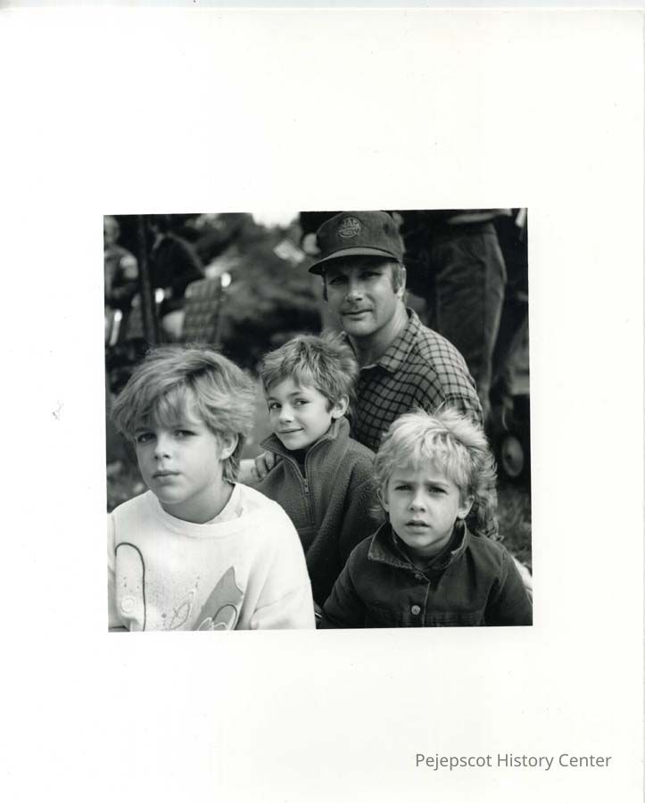 A black and white photograph of Frank Ranger and his family, who resided at 52 McClellan Street in Brunswick, ME. The photograph was taken at Brunswick's 250th Anniversary Parade.