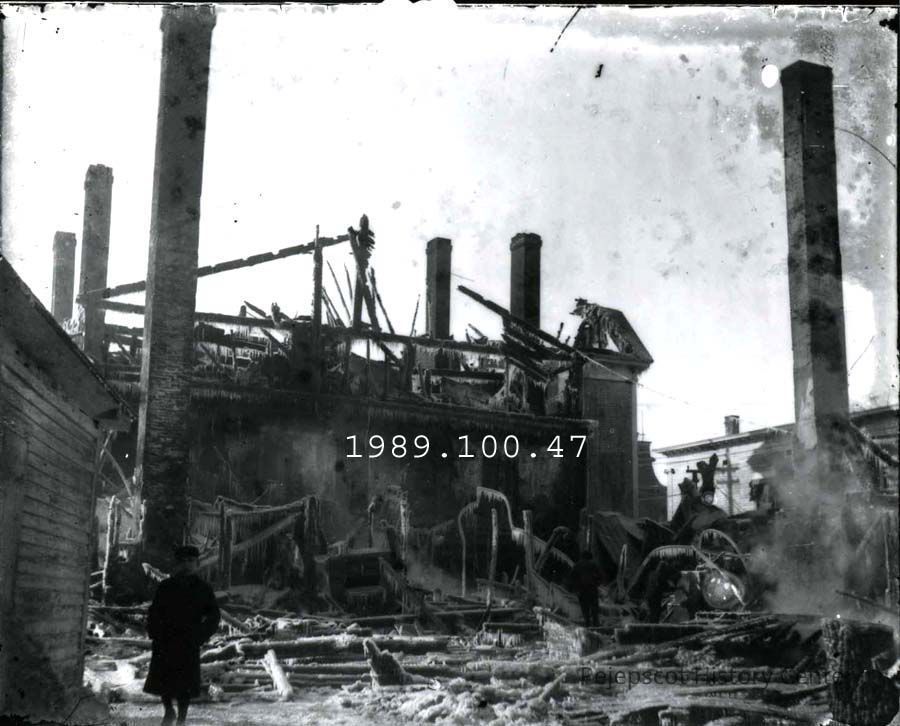 A B/W photograph of the ruins of the Tontine Hotel on the corner of School and Maine Street, Brunswick, after the big fire in 1904.