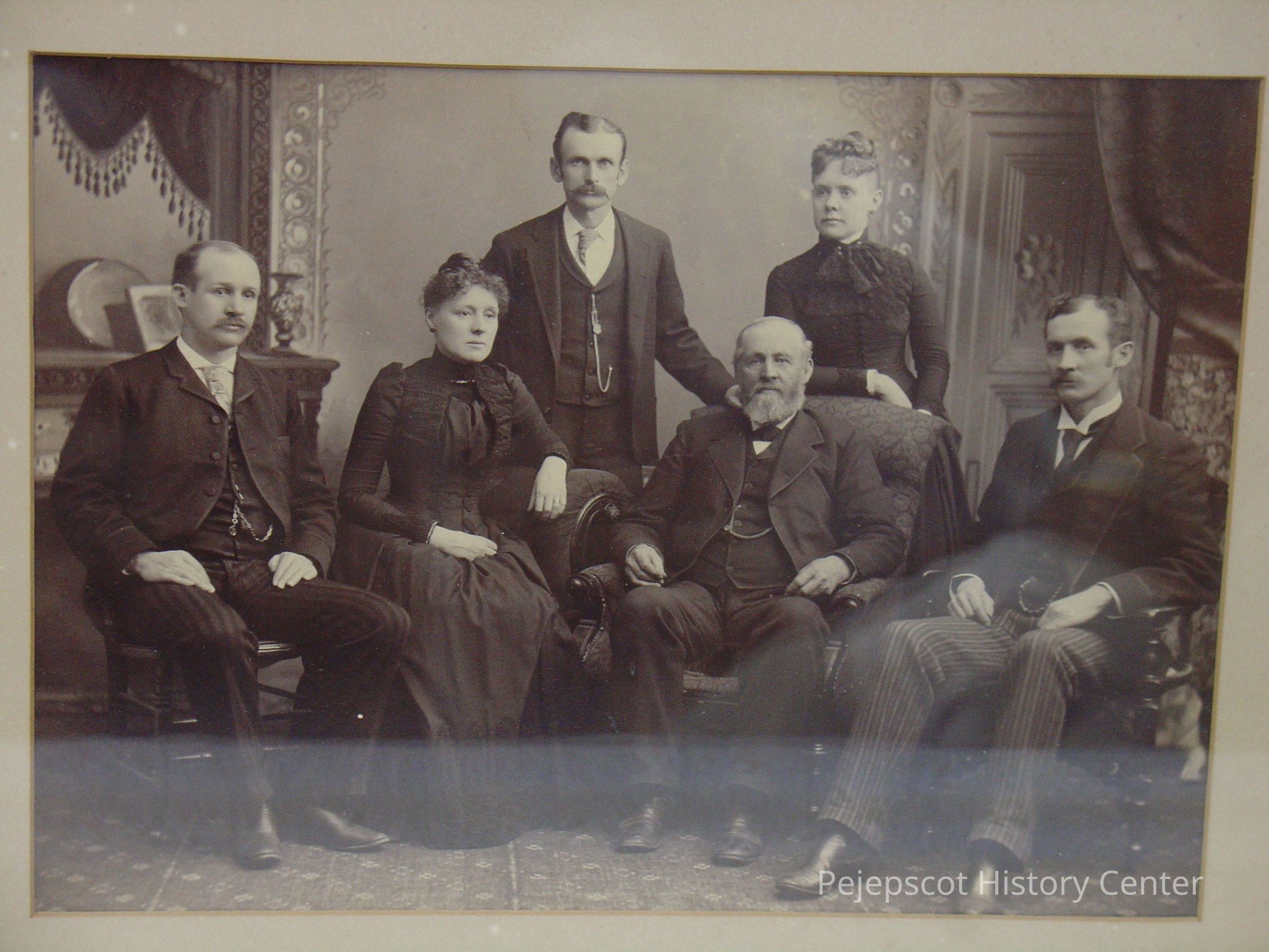 Black and white photograph mounted on matboard of Jordan Snow and his adult children Alphonso, Anna, George, Ned, and Ella. Jordan's wife Elizabeth is not pictured. No date.