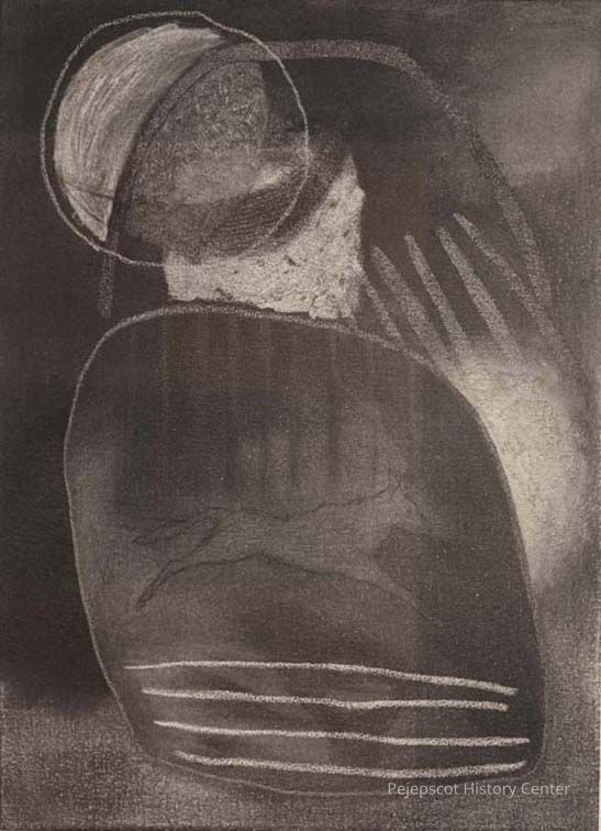 A black and white photo of the painting entitled "The Sun, the Moon, and the Void" by Anne Gresinger. Gresinger is a local Portland, ME resident after her completing her artistic education at the Skowhegan School of Painting and Sculpture, the Portland School of Art, and the Cleveland Institute of Art. She has had a series of exhibitions in Portland and Brunswick, ME, Ithaca, NY, and Cleveland, OH.