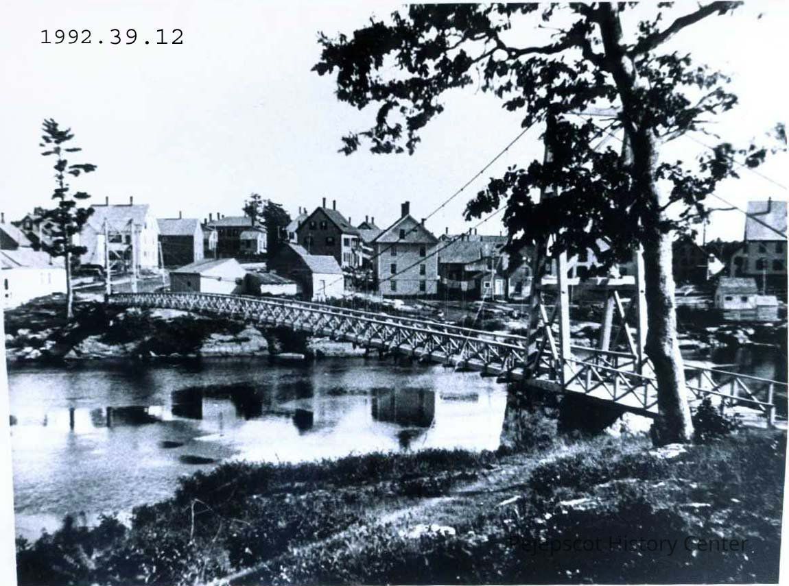 A B/W photograph of the Swinging Bridge taken from Topsham looking towards Mill Street, Brunswick, Maine. Undated.