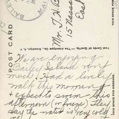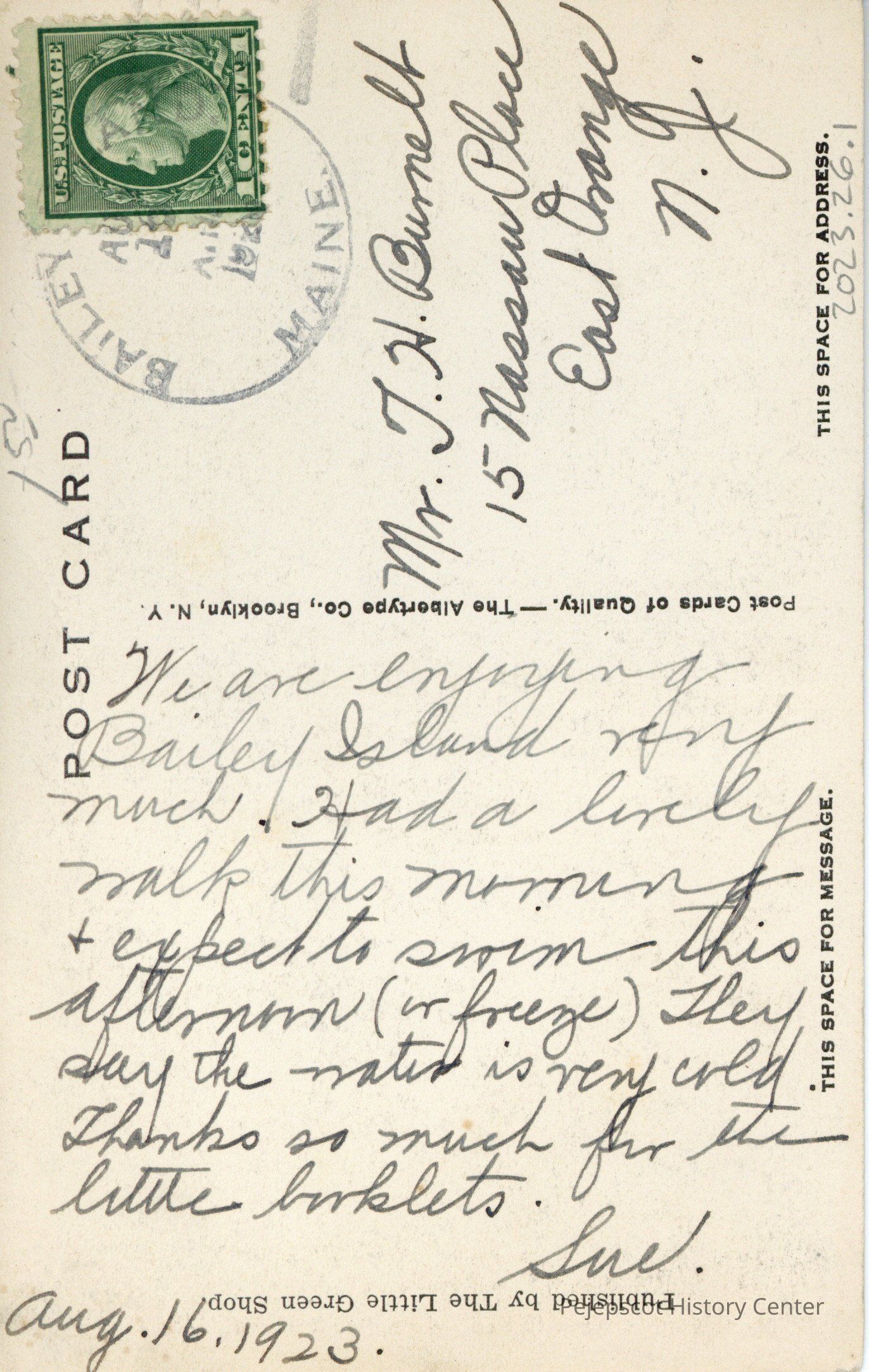 We are enjoying Bailey Island very much. Had a lovely walk this morning + expect to swim this afternoon (or freeze) They say the water is very cold. Thanks so much for the little booklets. Sue. Aug. 16, 1923.Transcriber