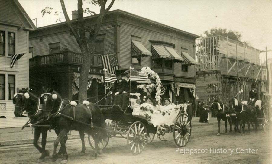 A B/W photograph of the 1916 parade. In the background the Pastime Theater is being built at 143-147 Maine St. 1916