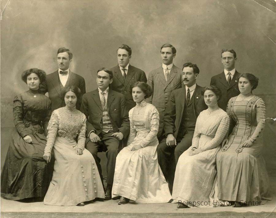 B/W photo of a theater group from St. John's Church, Brunswick, ME. The people are: