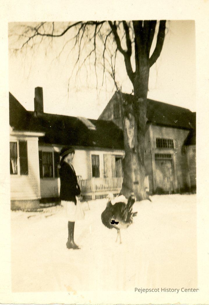 A sepia-toned 2" x 3" photograph of a young girl standing in front of a continuous farmhouse structure, in the snow, facing a large turkey.