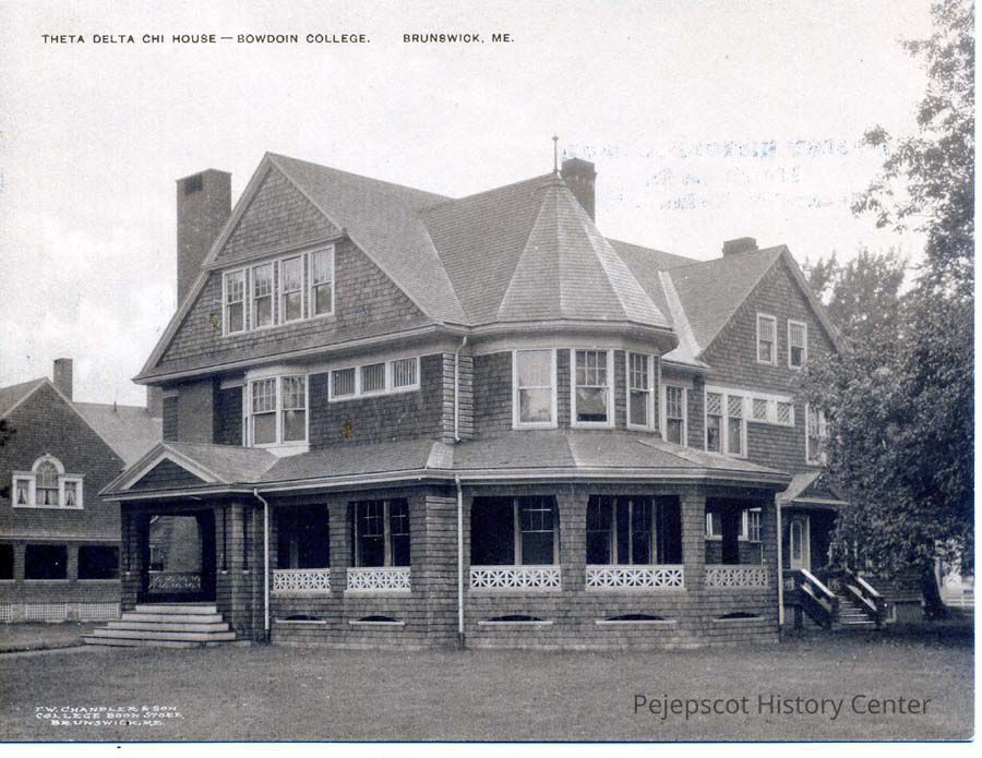 B/W postcard of the Theta Delta Chi house at Bowdoin College, Brunswick, Me.