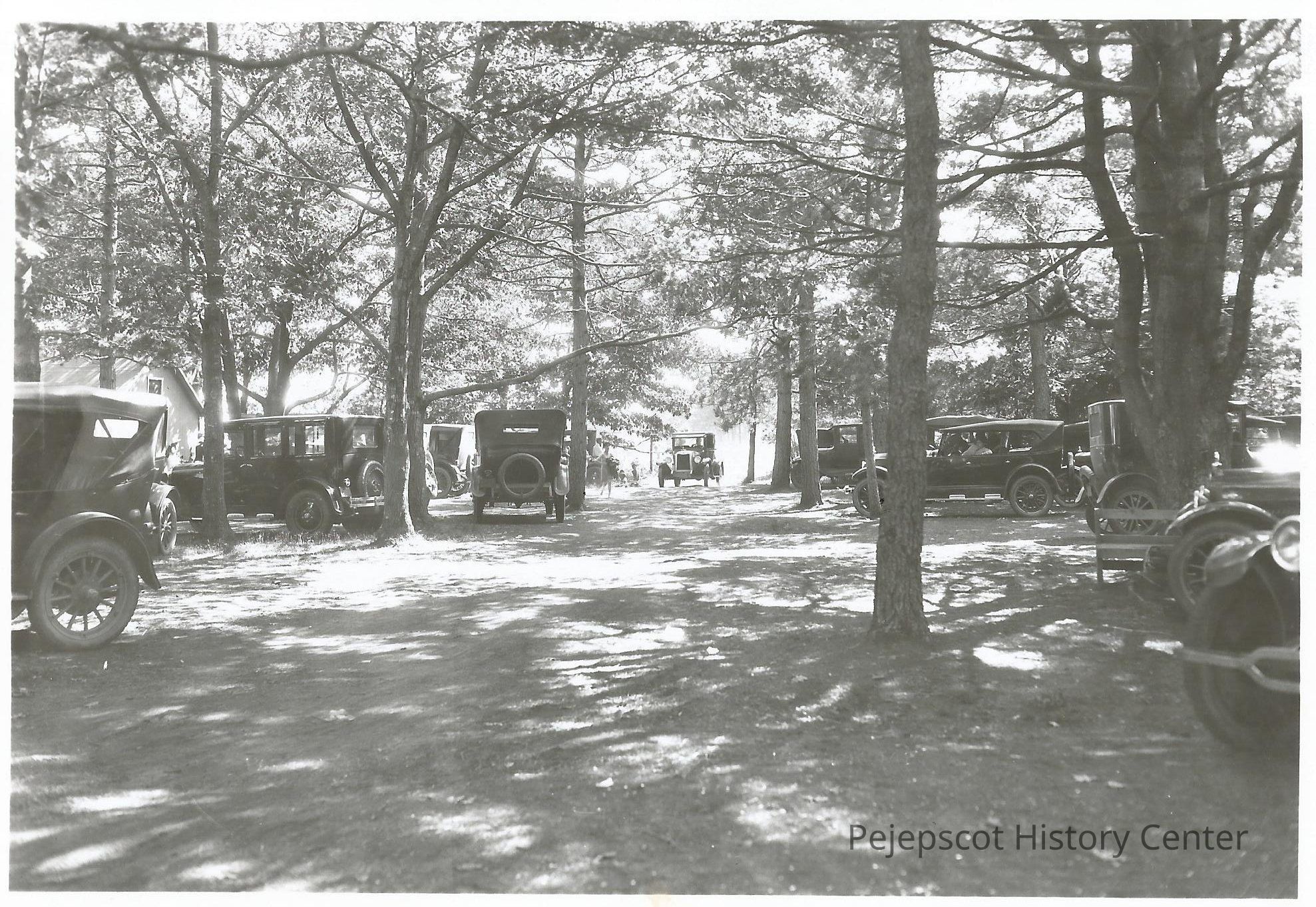 A B/W photo of the grove of trees and the automobiles parked at Thomas Point Beach. Undated