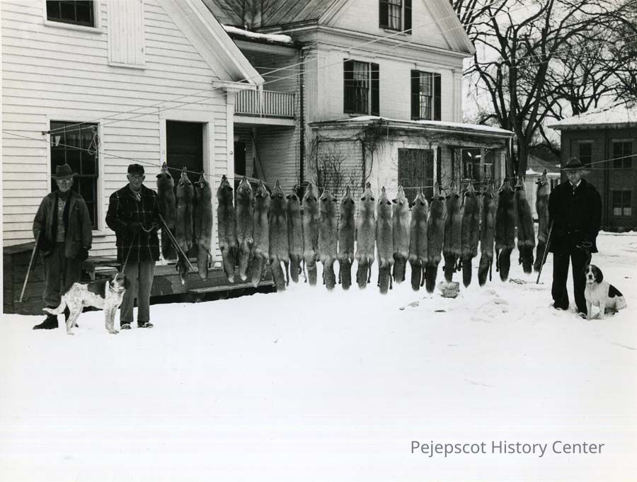 A B/W photograph of Thomas Randall and Ludger Messier with a large number of foxes they shot. The house is on the corner of Cumberland and Union Street. The Union Street School can be seen in the background. Undated