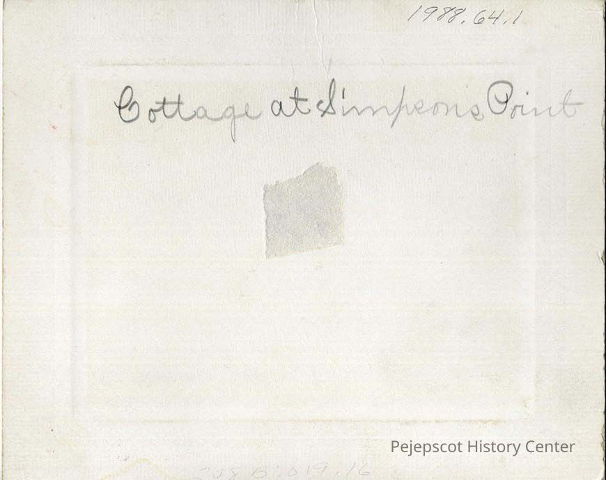 "Mr. Greene, Albert and I at Simpson's Point, July 10, 1898." According to the accession record, this hand-written description may in fact mistakenly appear on the back of 64.2, which is a picture of the cottage.