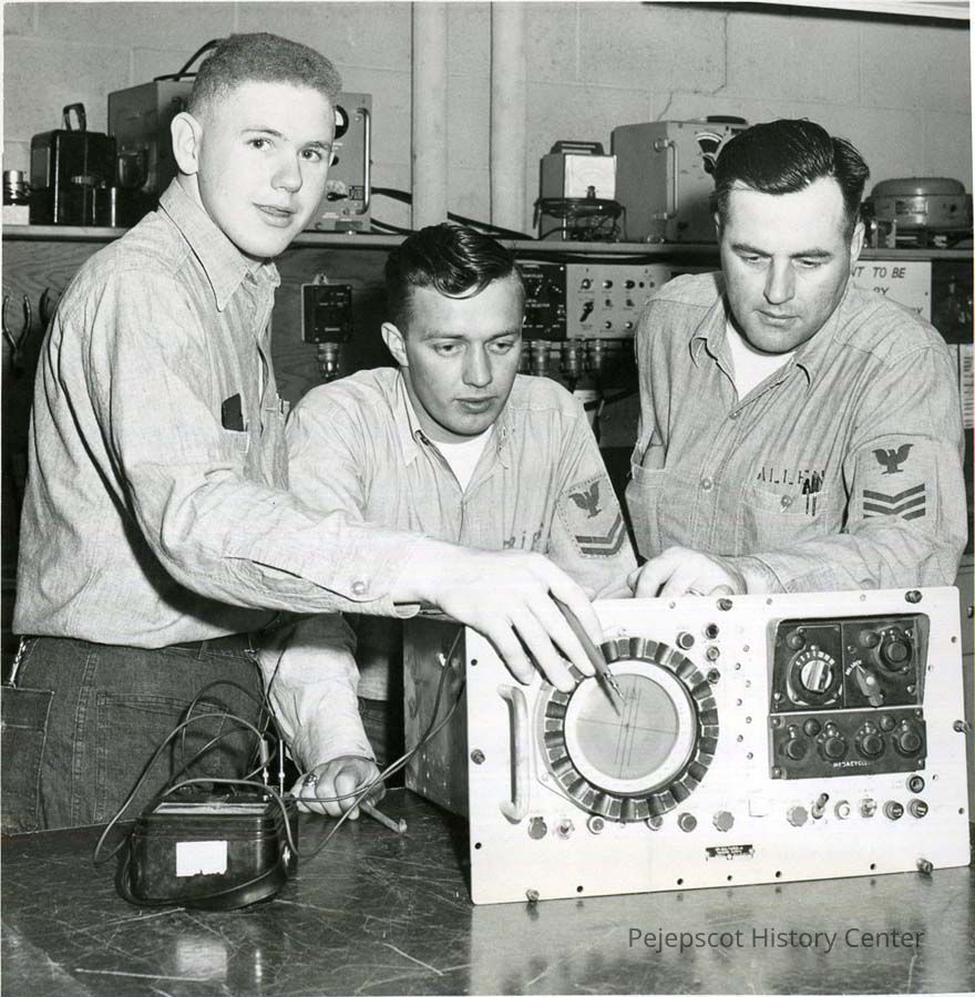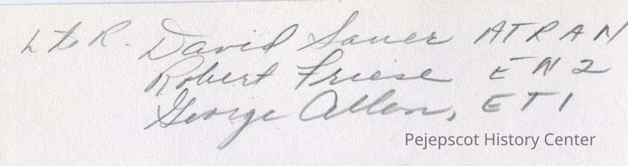 A B/W photograph of three Navy men. They are David Sauer, Robert Friese and George Allen. See back of photo for more info. Undated