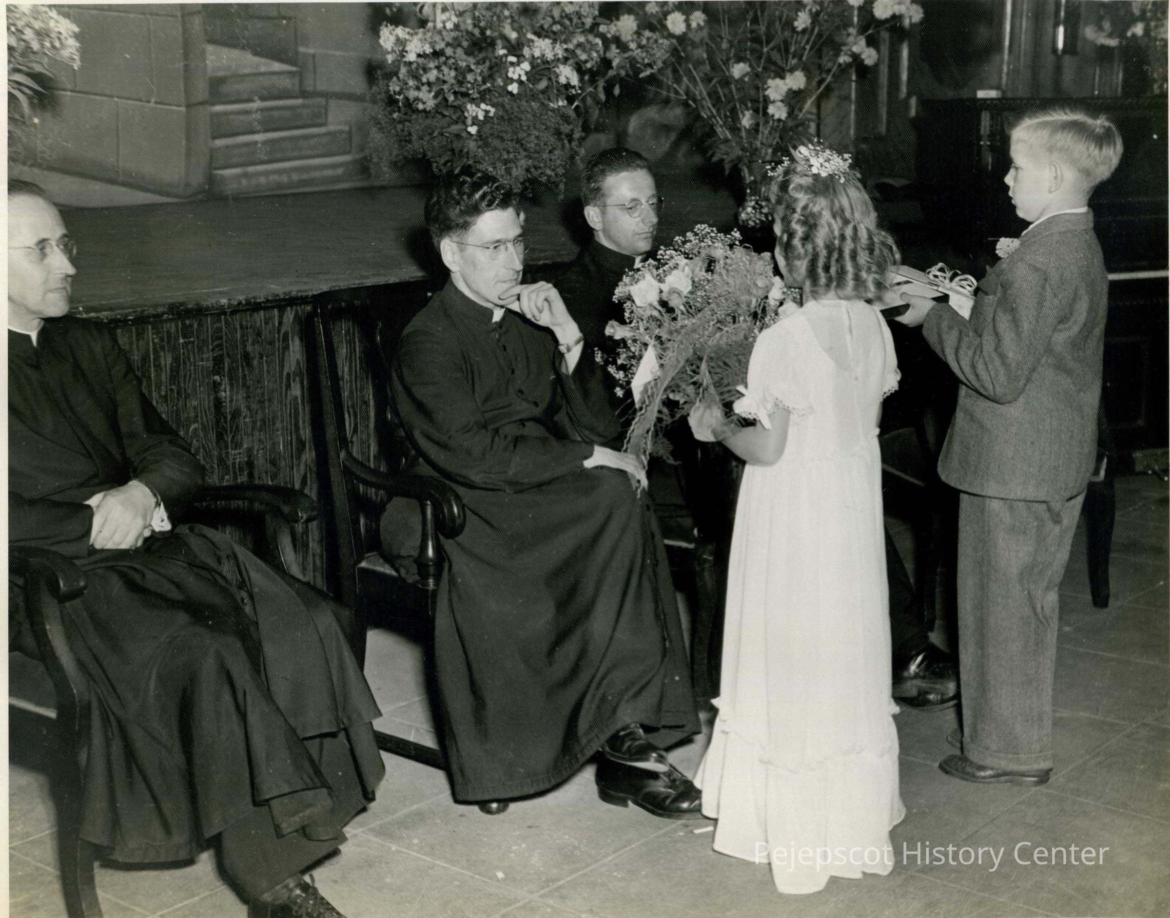 A B/W photograph of three priests and two small children with gifts. Undated