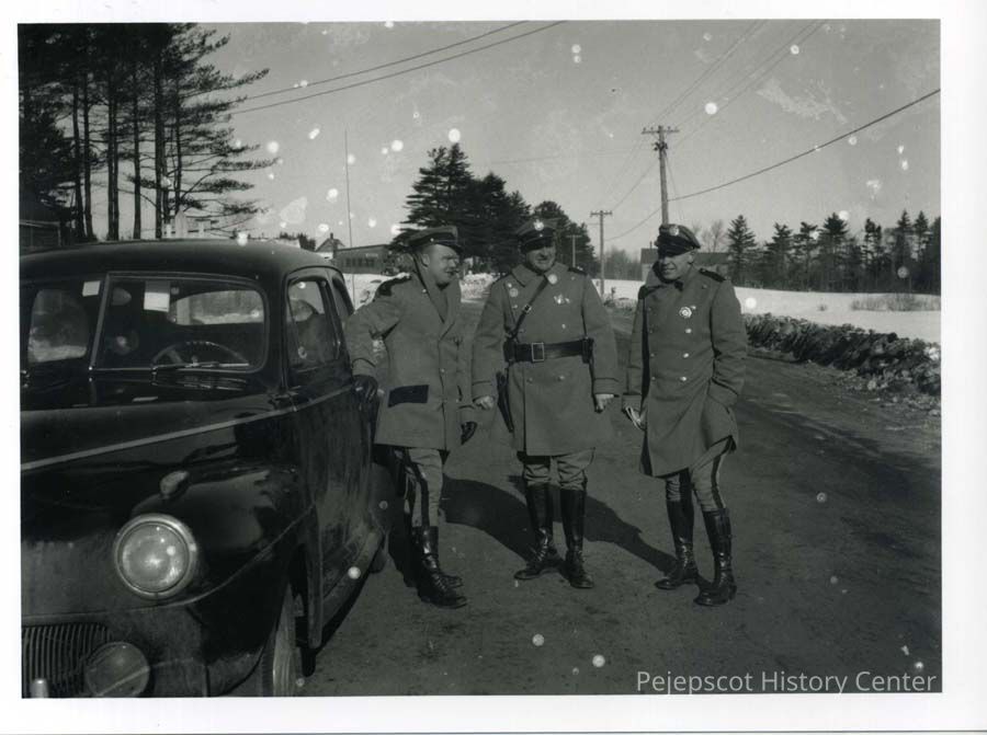B/W photograph of three State Cops standing by a car at the scene of the Ruby Heskett - Betty Magee accident at the Lewiston Road intersection. Cops left to right: Roger Whitmore, Herbert Marriner, and Walter Higgins. Photograph taken on January 31, 1944.