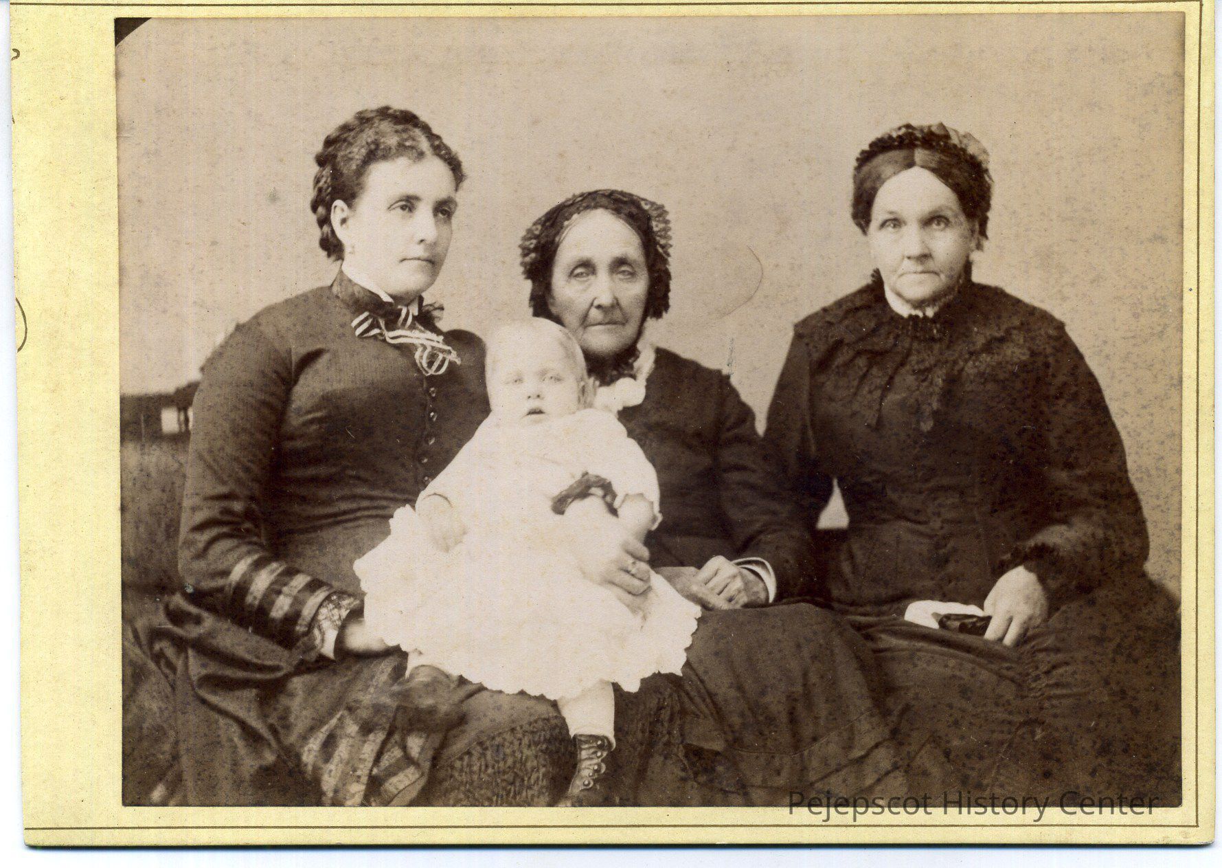 Sepia image of three unidentified seated women, dressed in dark clothing; the youngest woman holds an infant in a white gown with dark button boots. (This photo may depict four generations of the same family.) This photograph was taken by A.O. Reed at his studio in Brunswick. UndatedLexicon