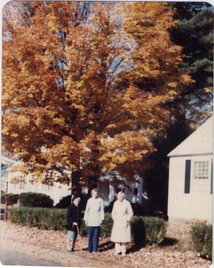 A color photograph of three women standing amongst the fall leaves. Undated