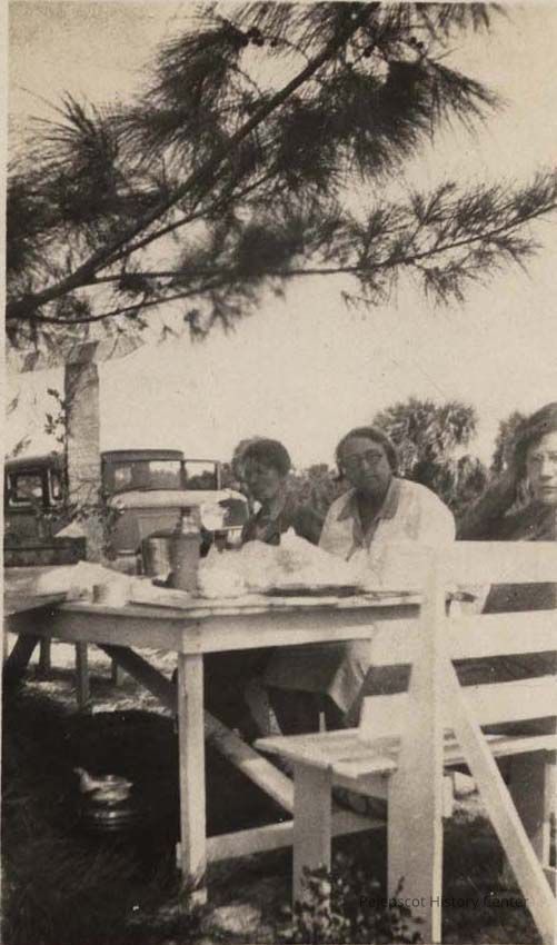 A B/W photograph of three women sitting at a picnic table. Undated