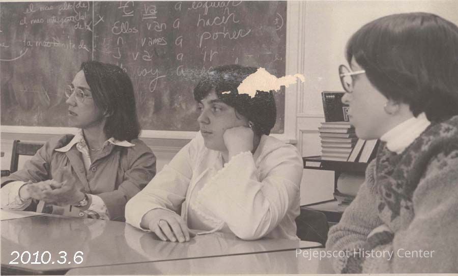A B/W photograph of three women sitting in a classroom. 05/12/1978