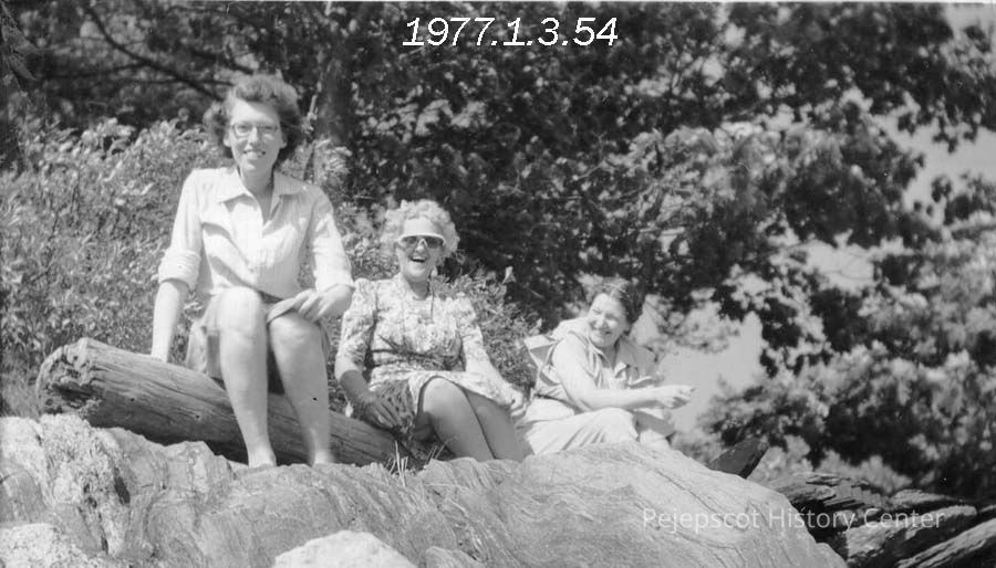 A B/W photograph of three women sitting on a rock. They are left to right, Annette Bonang, Mary Lilly and Helen Snow. Undated
