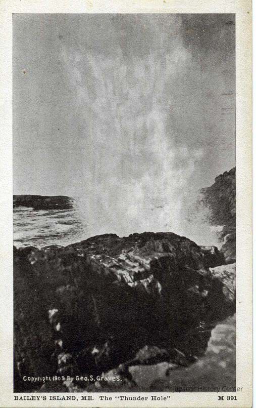 A black and white postcard depicting the Thunder Hole on Bailey Island, Maine, showing surf crashing on the rocks and a plume of water in the air. Geo. S. Graves copyrighted the postcard in 1909. The postcard is numbered M 391.Lexicon