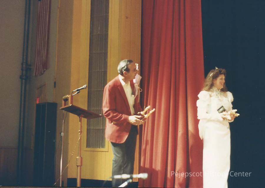 A color photograph of Gene Gagne announcing the name of Tiffany Barker. Photographers number 4-14 CYO sponsored
