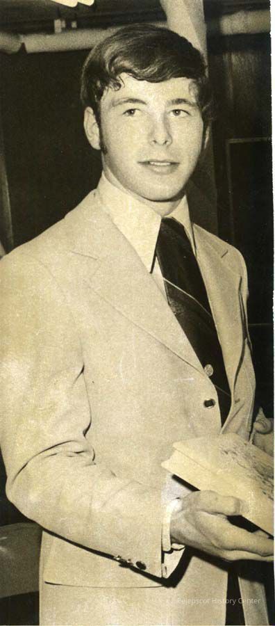 A black and white photo of Tim Griffing, master of ceremonies at a program the Baptist Youth Fellowship in Topsham, is cropped from a photo that appeared in The Times Record in Brunswick, Maine, on 5/4/1973. See 2003.546.3.153.