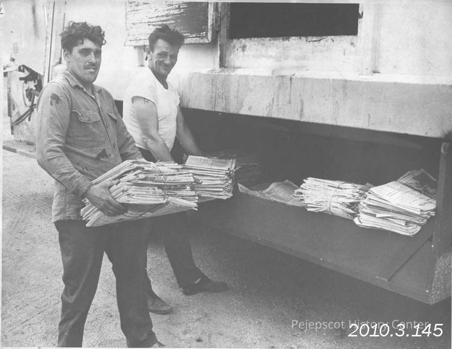 A B/W photograph of Tim Sinclair and Joe Derocher taking part in Brunswick recycling. Photo published 5/1/1973. Undated