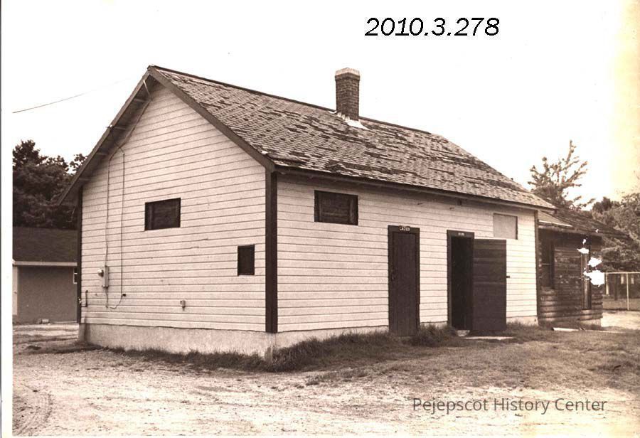 A B/W photograph of the woodframed building housing the toilets at Edwards Field, Brunswick. This building was torn down in 1970 to make room for a new concrete block building. See 2010.3.279. Photo was published 10/7/1970. Undated