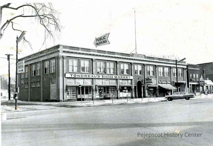 A B/W photograph of the Tondreau Block. Tondreau's Master Market and The Fashion Shop are located there. 85-99 Maine St. Undated