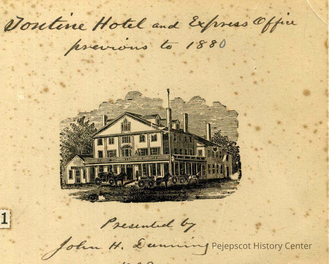 A B/W print of the Tontine Hotel, Maine Street, Brunswick, Maine. It's inscribed "Tontine Hotel and Express Office previous to 1880. Presented by John H. Dunning".