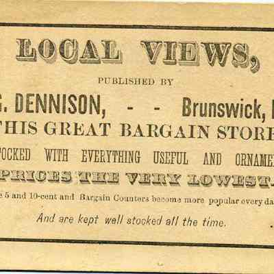 A sepia toned stereo photo of the Tontine Hotel, Maine Street, Brunswick, Maine as viewed from across Maine Street. There is a person standing on the balcony and there appears to be someone else, below them on the ground floor. On the reverse it reads: "Local Views, Published by B.G. Dennison, -- Brunswick, Me. This great bargain store is stocked with everything useful and ornamental. Prices the very lowest. The 5 and 10-cent and Bargain Counters become more popular every day. And are kept well stocked all the time."Collection
