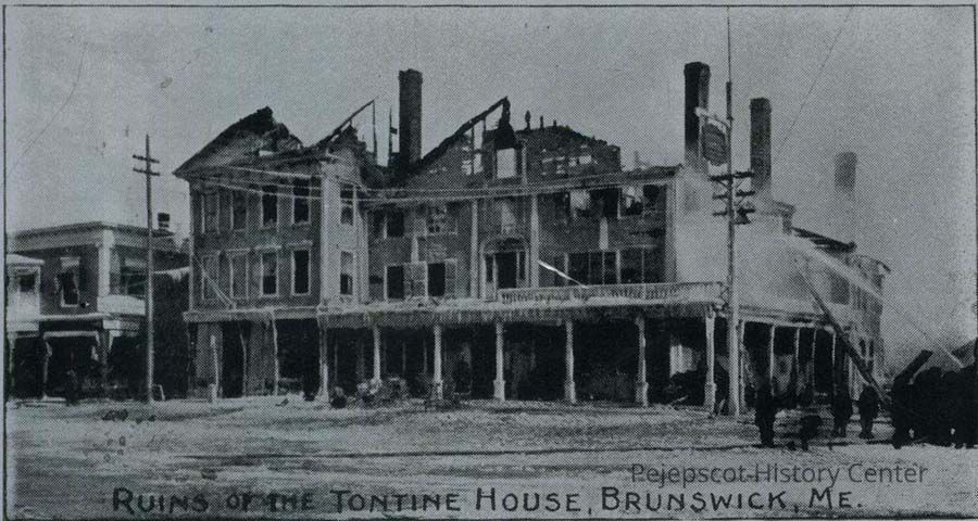 A B/W photograph of the Tontine Hotel, Maine Street, Brunswick, Maine, after the fire. Dated 01/1904.