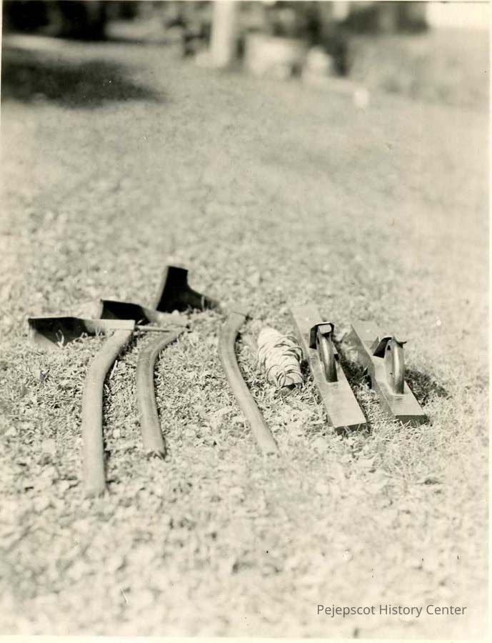 A B/W photograph of some tools used in shipbuilding including an adze. Undated