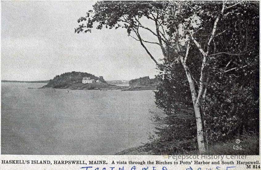 A B/W photographic view of the Toothaker House on Haskell Island. A vista through the birches to Pott's Harbor and South Harpswell.