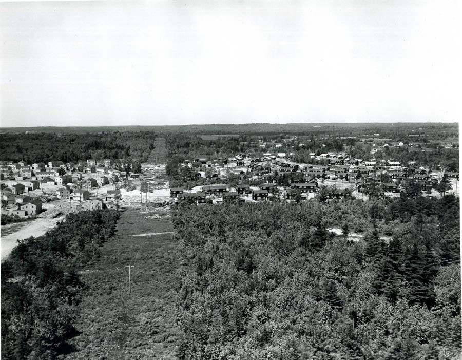A B/W aerial photograph of Topsham Air Force base housing. Undated