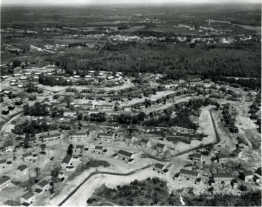A B/W aerial photograph of Topsham Air Force base housing. Undated
