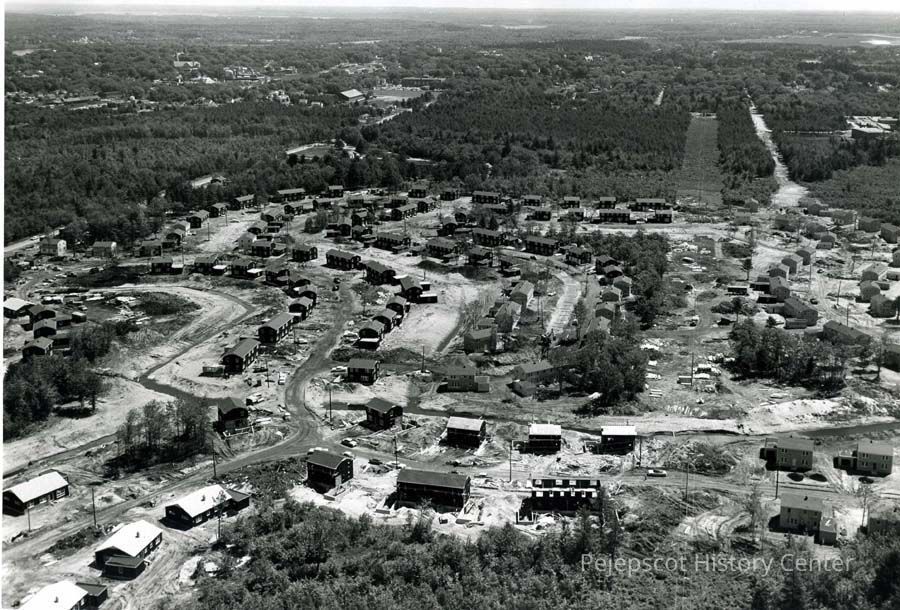 A B/W aerial photograph of Topsham Air Force base housing. Undated